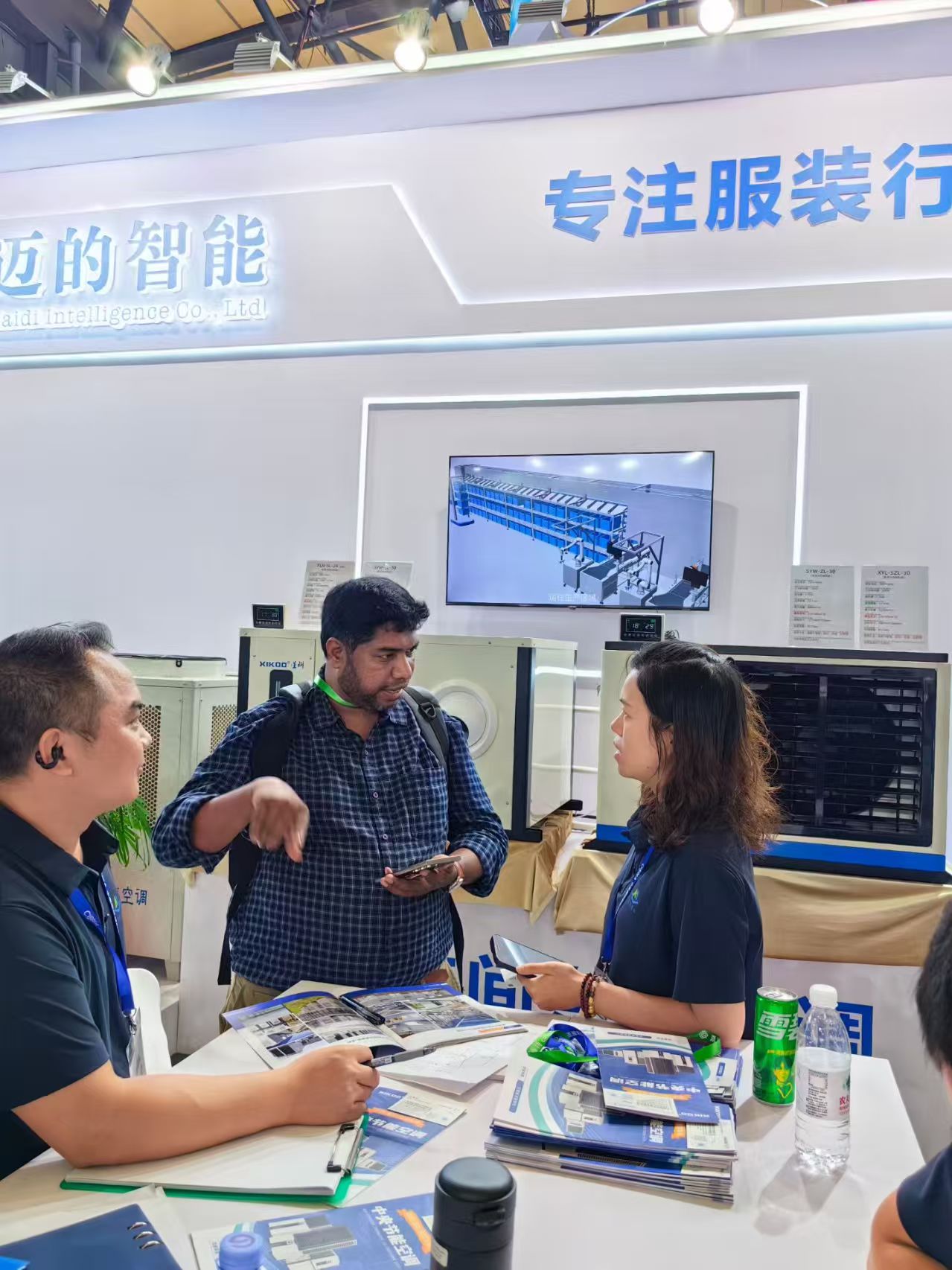 服装制造业对生产环境有严格要求,车间温湿度失衡易导致生产效率下降、设备故障率升高及产品质量问题。针对这些行业痛点,东蓝风工业空调基于对全球客户需求的深入分析,开发了“大型车间智能降温管理系统”。该系统通过动态环境感知、精准调节与智能运维功能,实现了从被动响应到主动优化的环境控制模式转变。在展会现场,东蓝风通过场景化演示展现了系统的实际应用效果,例如在设备密集区域自动强化局部送风以平衡热量,或在裁切作业区实现定向气流控制以保障工艺精度,其解决方案获得了国际客户的积极评价。